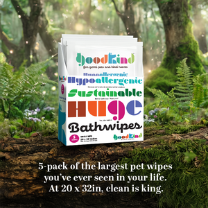 GOODKIND wipes are thoughtfully crafted for pets and the planet. Our regular grooming wipes are made from 100% biodegradable bamboo, while our oversized wipes are crafted from plant-based viscose, providing extra durability to tackle bigger messes without tearing. Both types are hypoallergenic, eco-friendly, and gentle on sensitive pet skin.